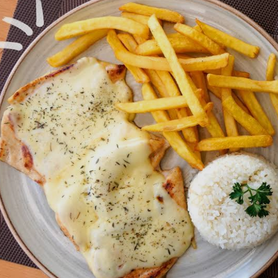 delicioso filete de pechuga con queso , papa francesa , yuca o criolla con arroz blanco