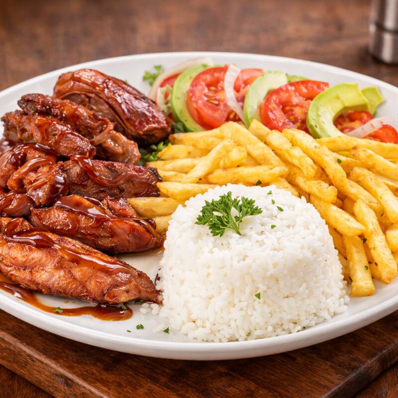 deliciosas costillas de cerdo en salsa bbq con papa francesa , yuca o criolla con arroz blanco
