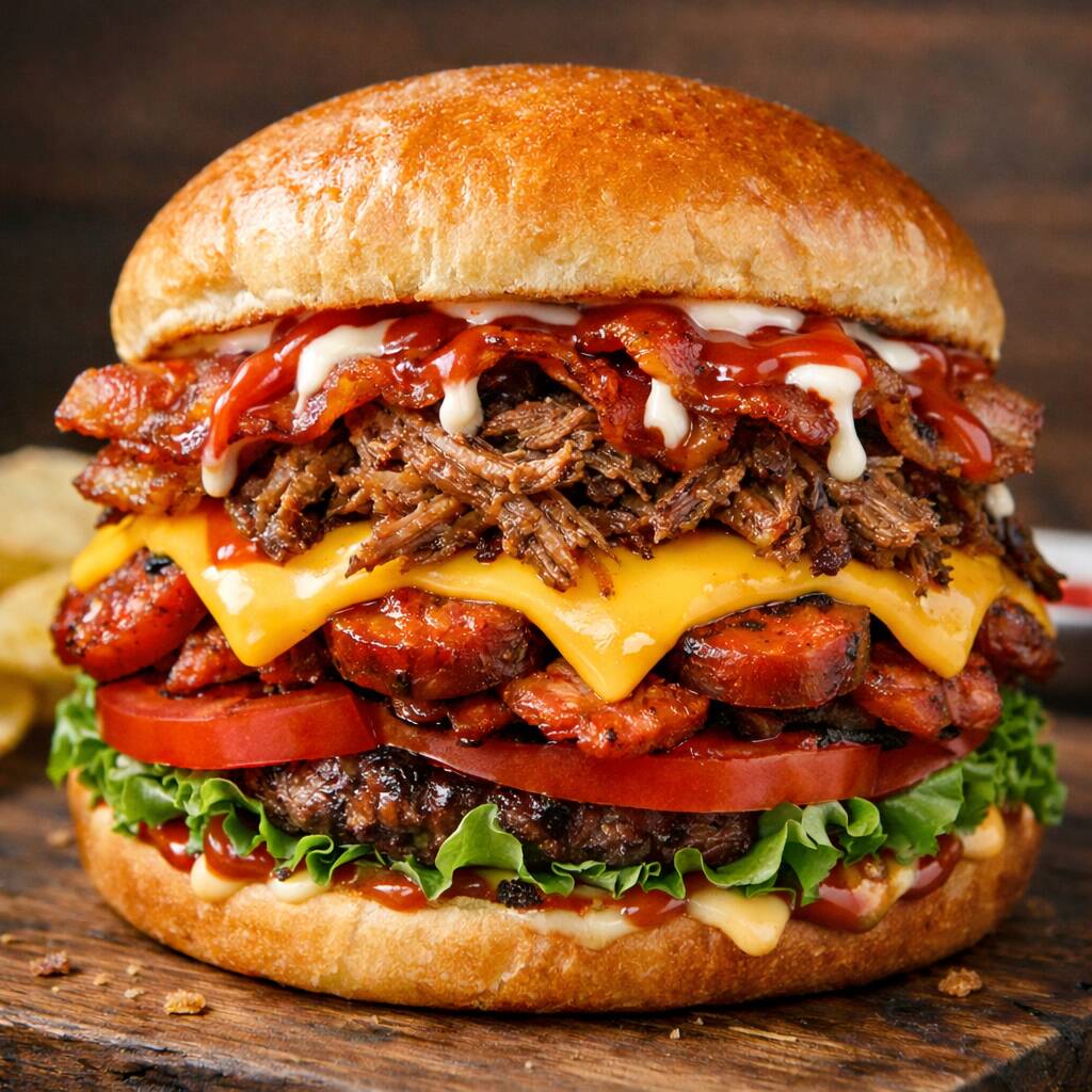 Carne de res (130 gm), chorizo, carne desmechada, queso americano y 2 tocineta entera, lechuga y tomate y salsas. Más gaseosa de 250 ml productos postobon disponibilidad de tienda.