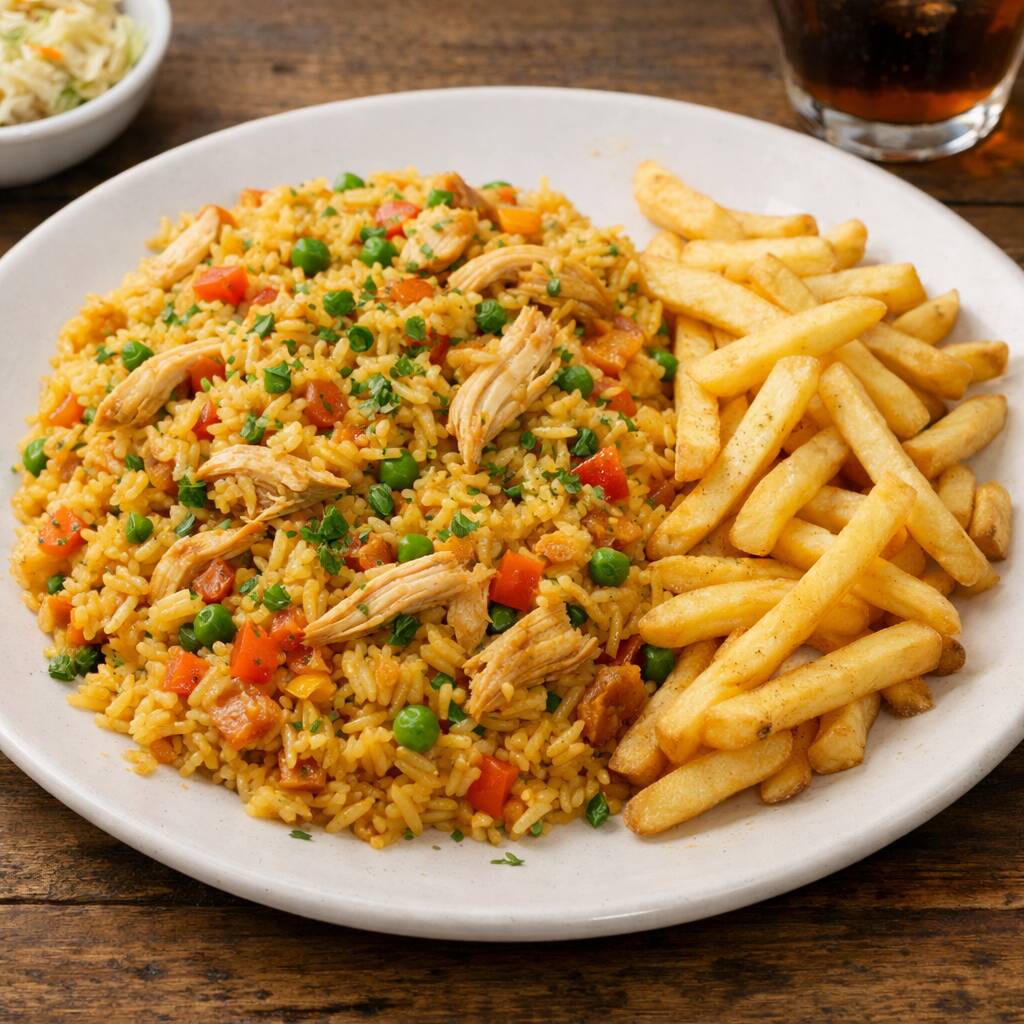 delicioso arroz con vegetales , salchicha , pollo desmechado con salsa de la casa acompañado de papa francesa yuca o criolla