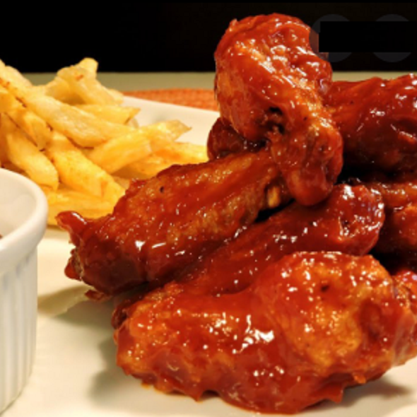 8 Increibles piezas de alitas bañadas en una exquisitas salsa BBQ acompañadas de papas a la francesa y Gaseosa