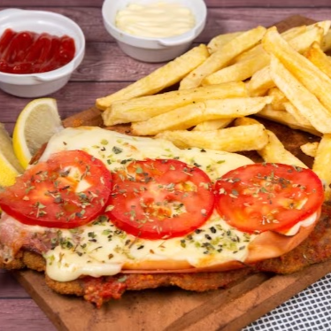 Exquisito Plato Ejecutivo De Pechuga Napolitana, Acompañado De Sopa Del Dia, Arroz, Papa, Plátano, Ensalada