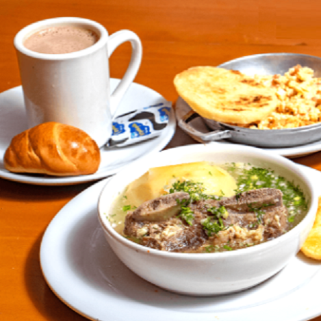 Exquisito caldo de costilla Exquisita Combinación de Huevos, Salchichas, Jamón, Queso Doble Crema, Acompañado de Arroz, Pan, Jugo de naranja o café.