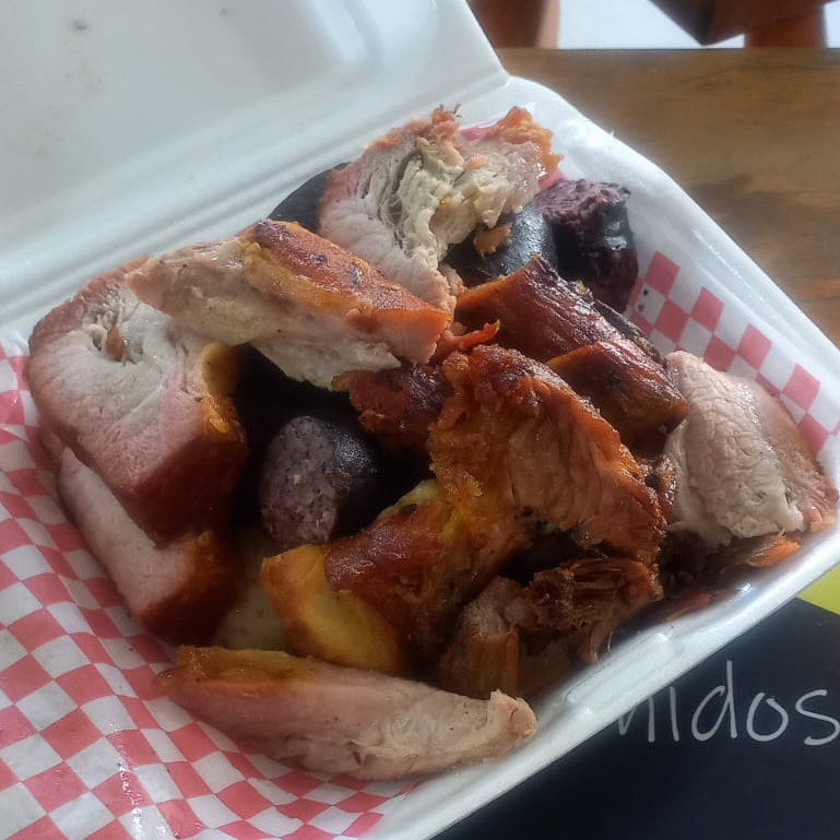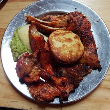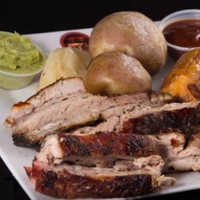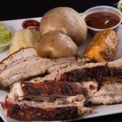 Exquisitas costillas de cerdo, acompañadas de papa, yuca, plátano, ensalada de la casa y guacamole.