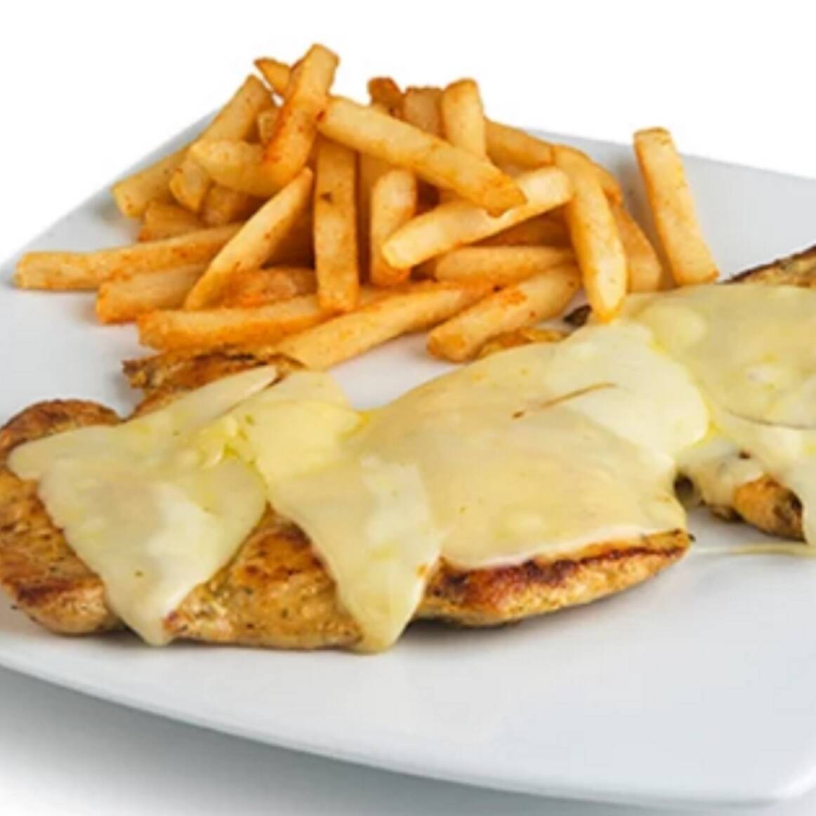 Filete de pechuga de pollo con queso fundido, acompañada de papa, yuca, plátano, ensalada de la casa y guacamole.