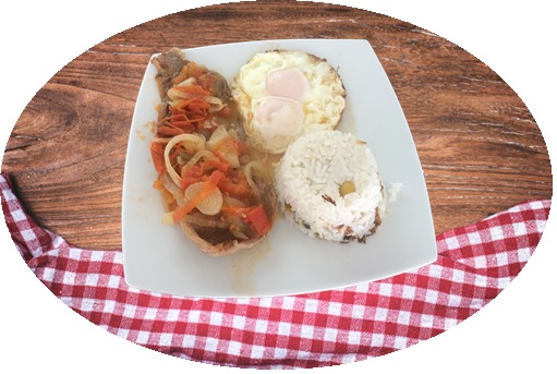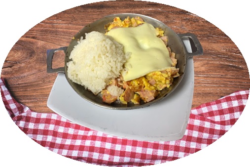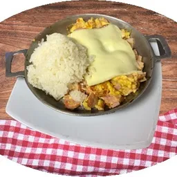 Huevos revueltos, salchicha ranchera ,cebolla,tomate, queso, jamón y arroz.