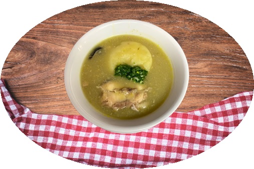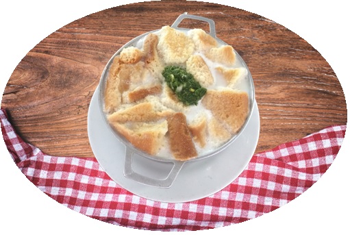 Chocolate 8 onzas, huevos revueltos o fritos a elección, pan y caldo de costilla (cebolla larga, cebolla cabezona, cilantro, costilla de resl papas y sal).