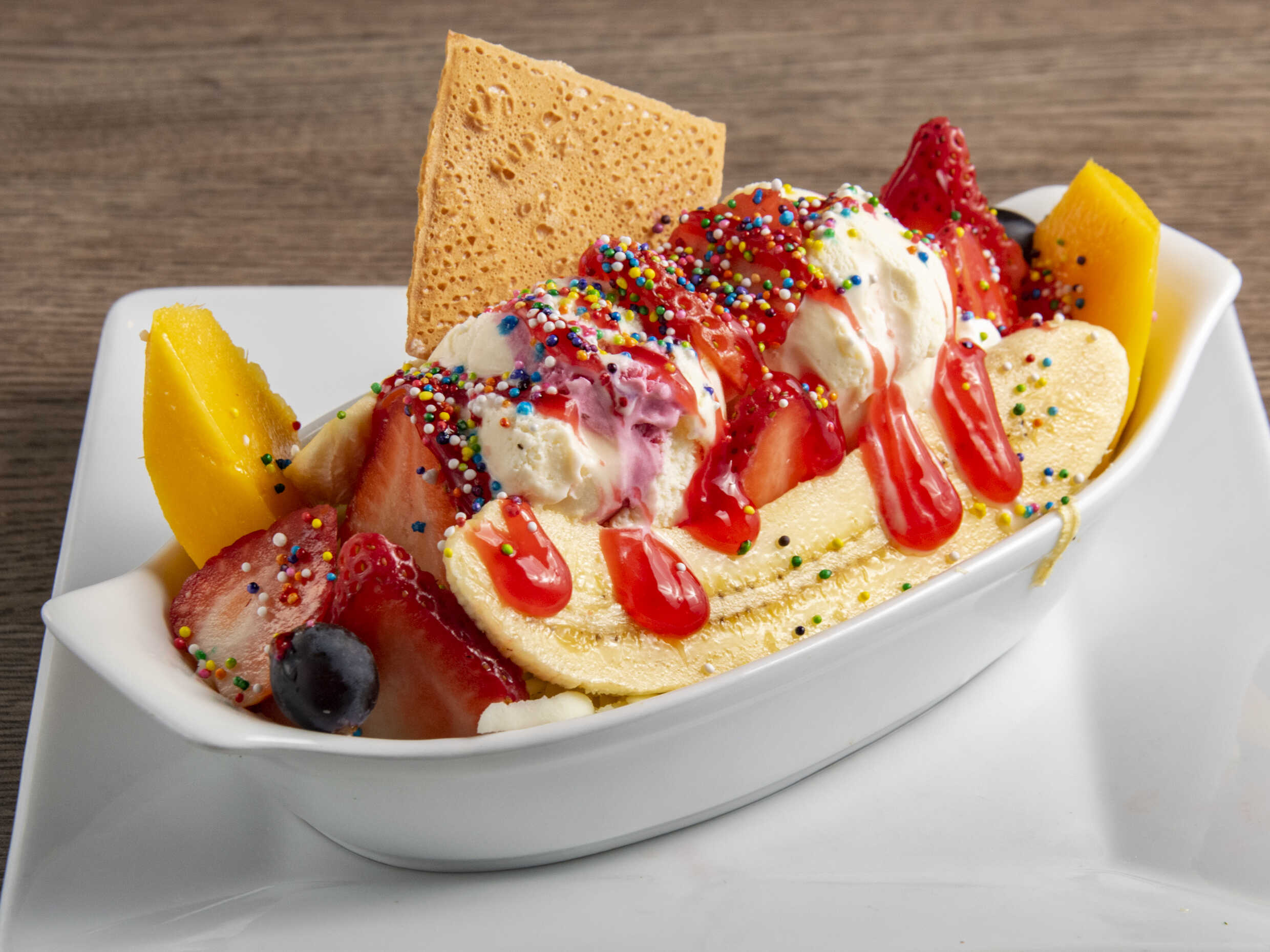Dos bananos, queso doble crema rallado, crema de leche y helado, decorada con crema chantilly.