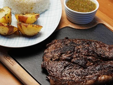 350 g Jugoso corte de res al grill con chimichurri incluye dos acompañamientos de tu preferencia.
