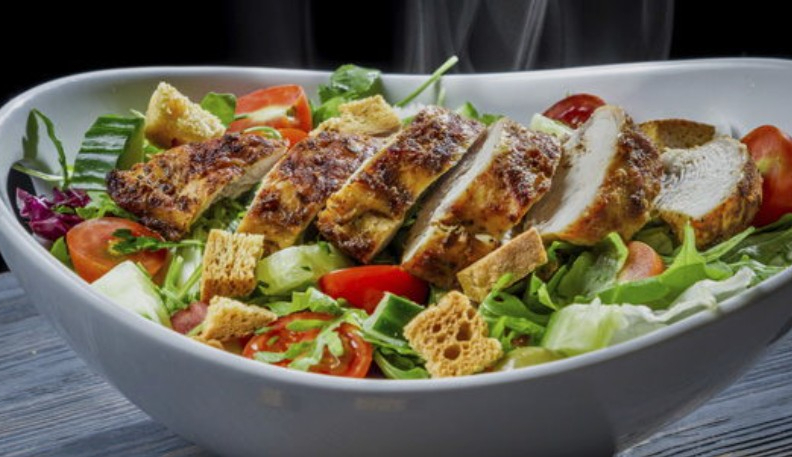 Lechuga mixta pechuga al grill camarones salteados maíz dulce queso parmesano y vinagreta de naranja.