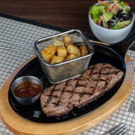 350 g Jugoso corte de res americano al grill incluye dos acompañamientos de tu preferencia.