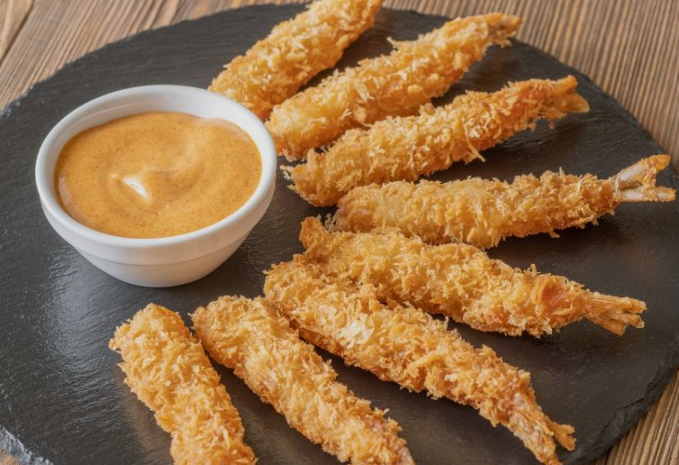 Camarones premium apanados acompañados con salsa tres quesos ensalada fresca y papas en casco.