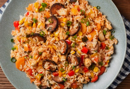 Delicioso arroz salteado con camarones seleccionados y vegetales frescos en salsa soya estilo oriental.