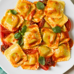 Pasta artesanal rellena de queso ricota espinaca y especias salteada en salsa napolitana o pesto con un toque de crema.