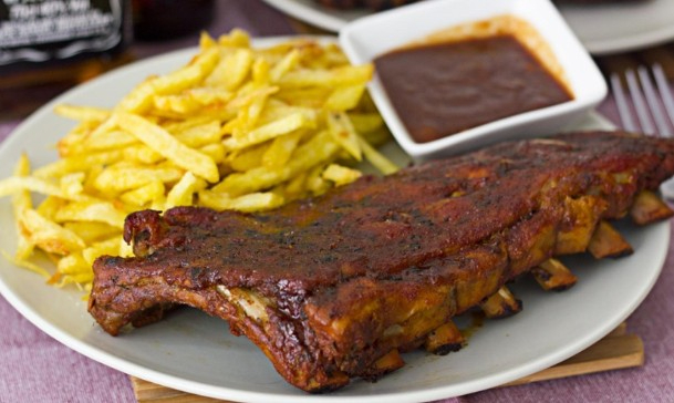 Tiernas costillas de cerdo al estilo americano en reducción de Jack Daniel's y BBQ con dos acompañamientos a elección.