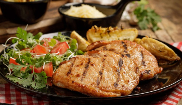 500 g Delicioso corte de cerdo en reducción de lulo sobre cama de puré de papa vegetales salteados y aguacate.