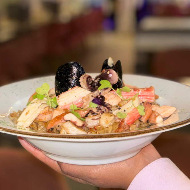 Exquisita pasta con camarones pulpo trocitos de salmón y aros de calamar en nuestra deliciosa salsa blanca artesanal.