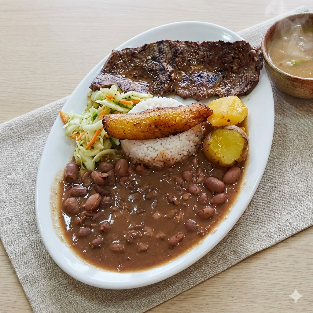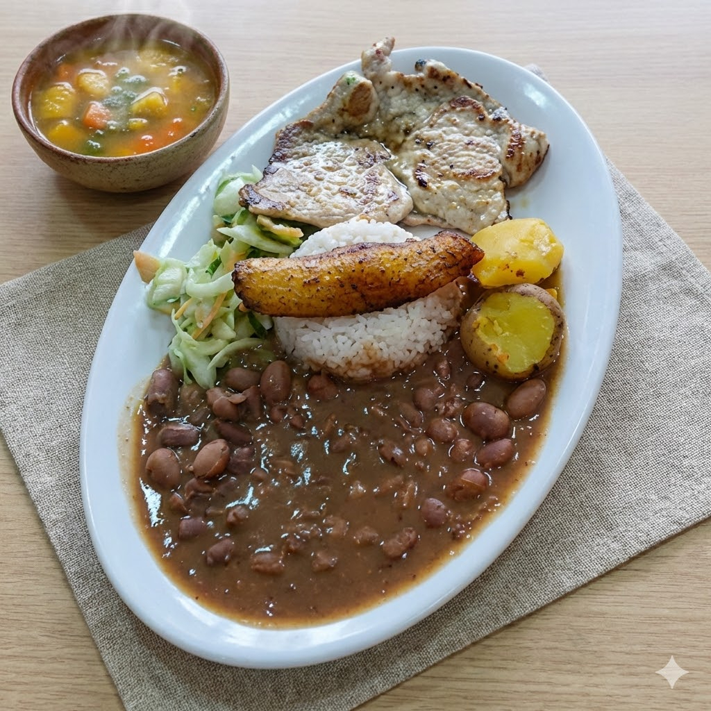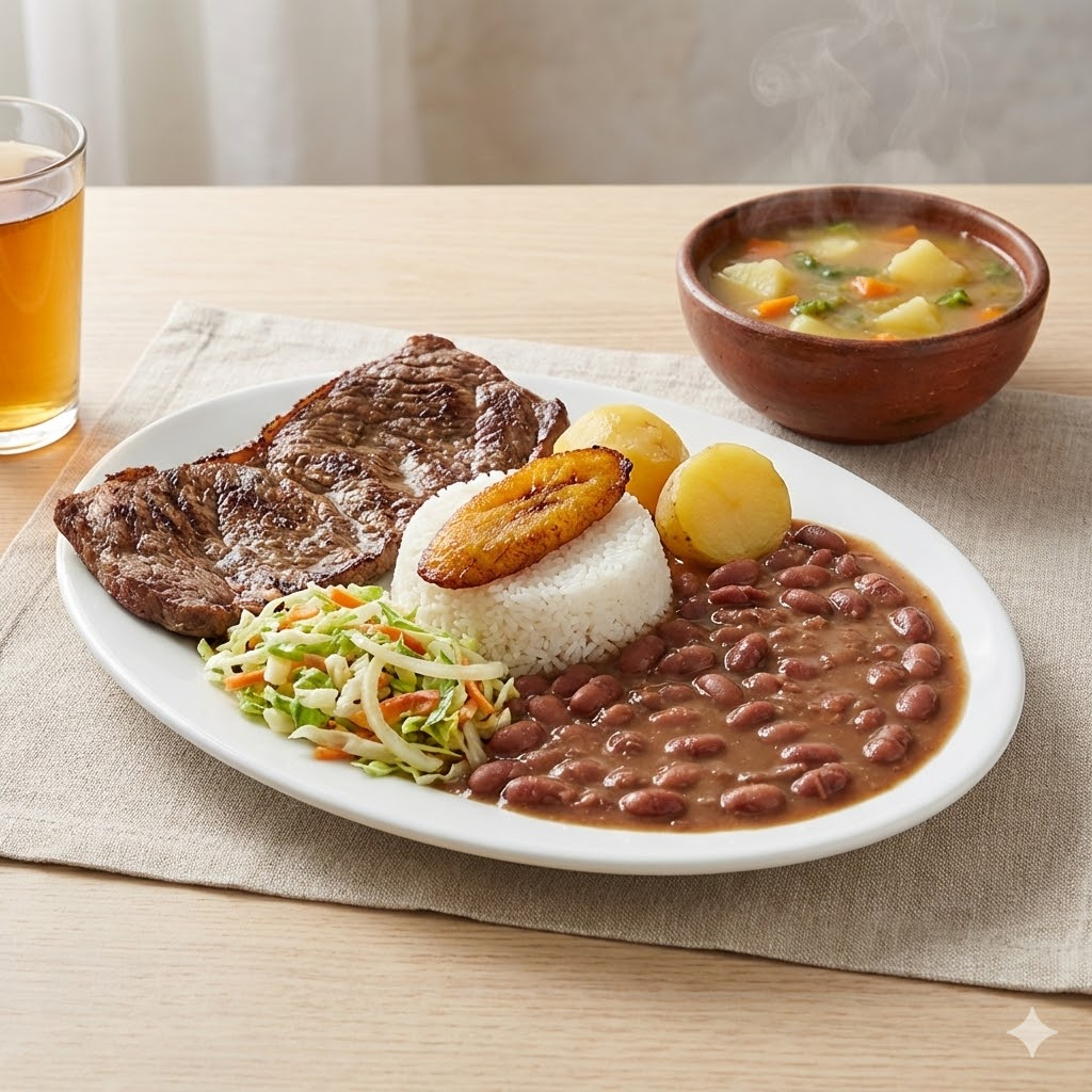 Ternera asada, papa, plátano, arroz, ensalada y frijol.