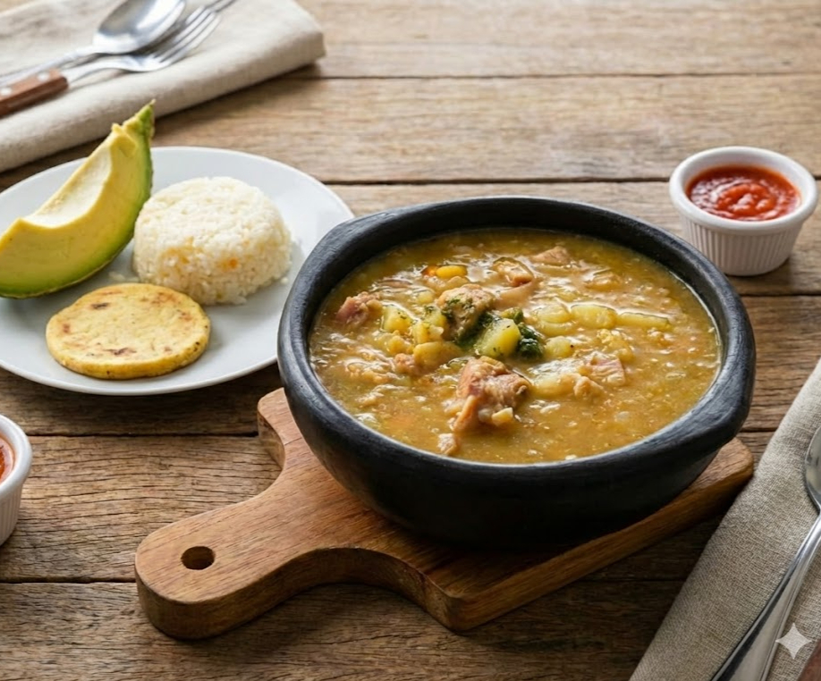 Una sopa tradicional hecha con costilla de res cocida a fuego lento, acompañada de papa, yuca, zanahoria y especias. Es un plato energético.