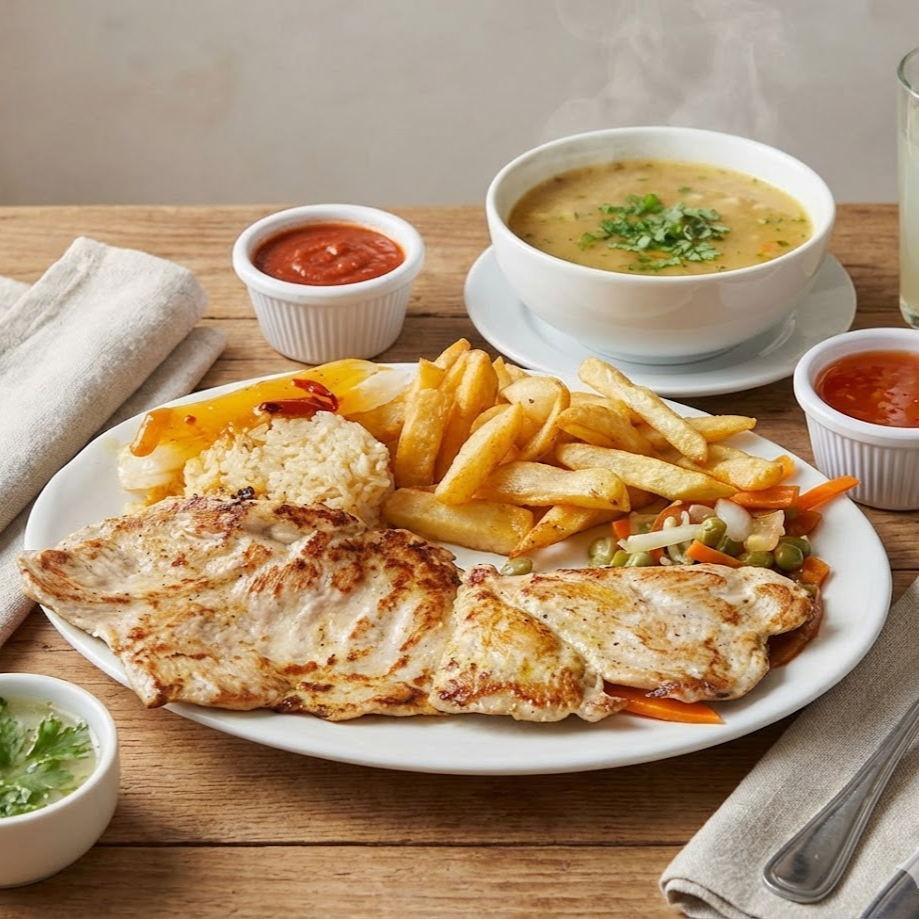 Pechuga de pollo asada + Arroz + Papas a la francesa + Ensalada + Sopa del día. Un almuerzo completo, fresco y preparado al momento