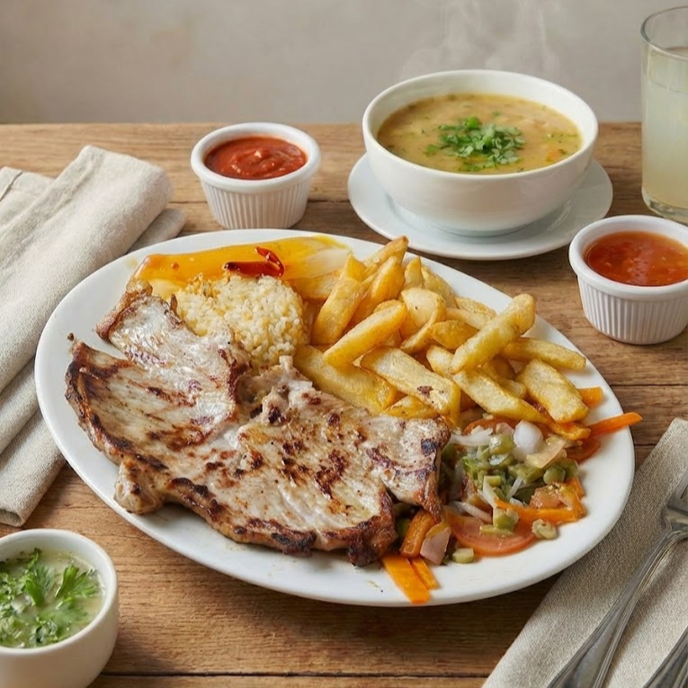 Lomo de Cerdo + Arroz + Papas a la francesa + Ensalada + Sopa del día. Un almuerzo completo, fresco y preparado al momento