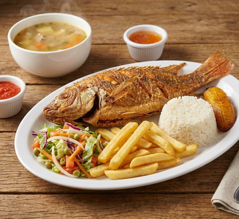 Mojarra Frita + Arroz + Papas a la francesa + Ensalada + Sopa del día. Un almuerzo completo, fresco y preparado al momento