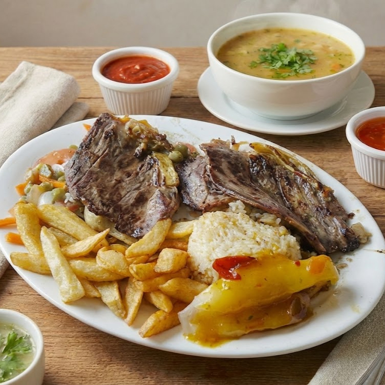 carne Asada + Arroz + Papas a la francesa + Ensalada + Sopa del día. Un almuerzo completo, fresco y preparado al momento