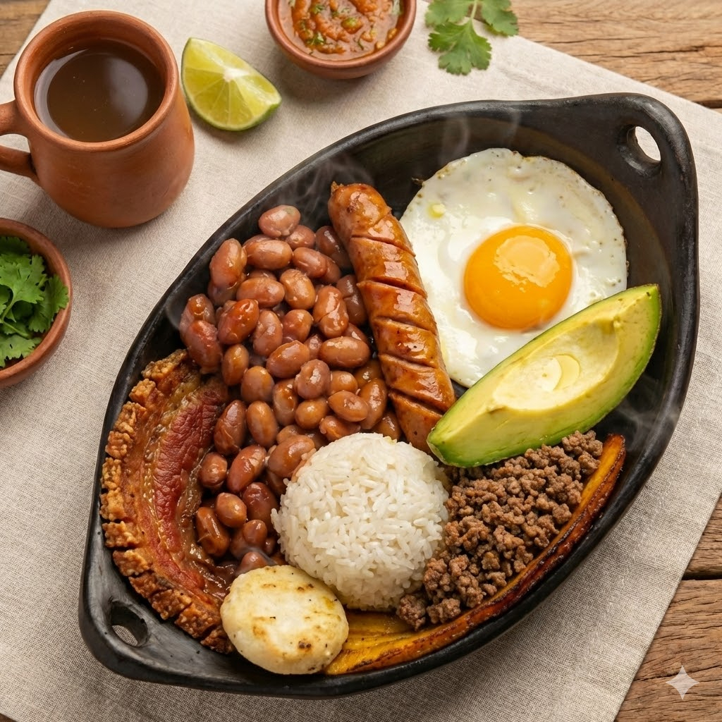 Platillo personal: arroz blanco, frijol, arepa, carne de cerdo, chorizo, plátano, aguacate y huevo frito.