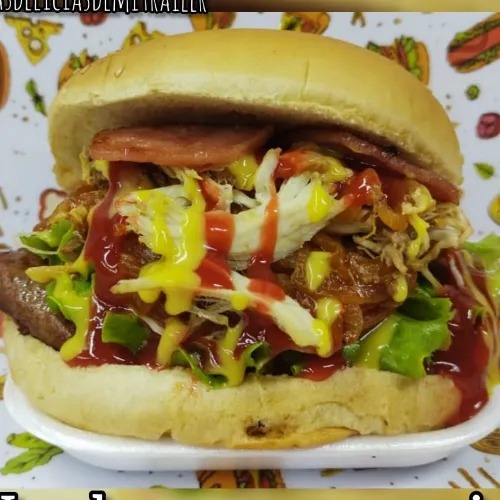 Hamburguesa de pollo apanado de 200 grs, carne de hamburguesa de res de 200 grs, lechuga, jamón ahumado, pollo desmechado, cebolla, tomate, papa fosforito y tocineta.