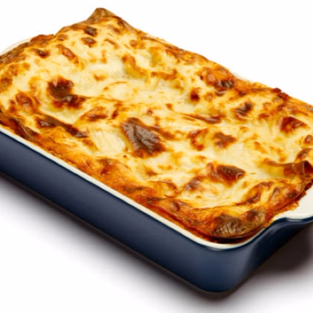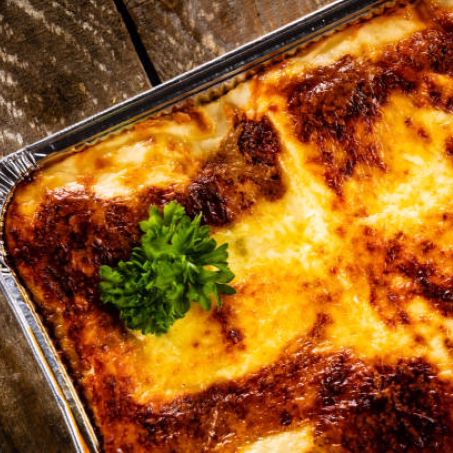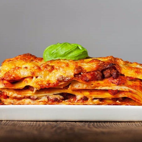 Lasagna de 600 gramos con carne bolognesa y pollo desmechado en salsa napolitana con finas hierva, gratinada con queso tipo mozzarela y porcion de pan horneado