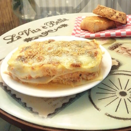 Lasagna de pollo desmechado en salsa napolitana con finas hiervas, gratinado con queso mozzarella y porcion de pan horneado.