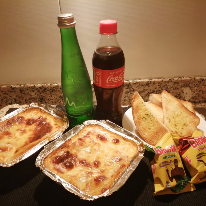 2 Lasagnas sabor a elección, con porción de pan horneado, 2 cervezas budweiser x 269 ml y 2 mini brownies.