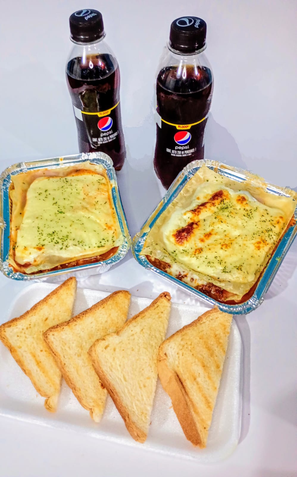 Combo: lasaña de pollo y lasaña mixta con pan tajado en laminas y gaseosas de 250 ml.