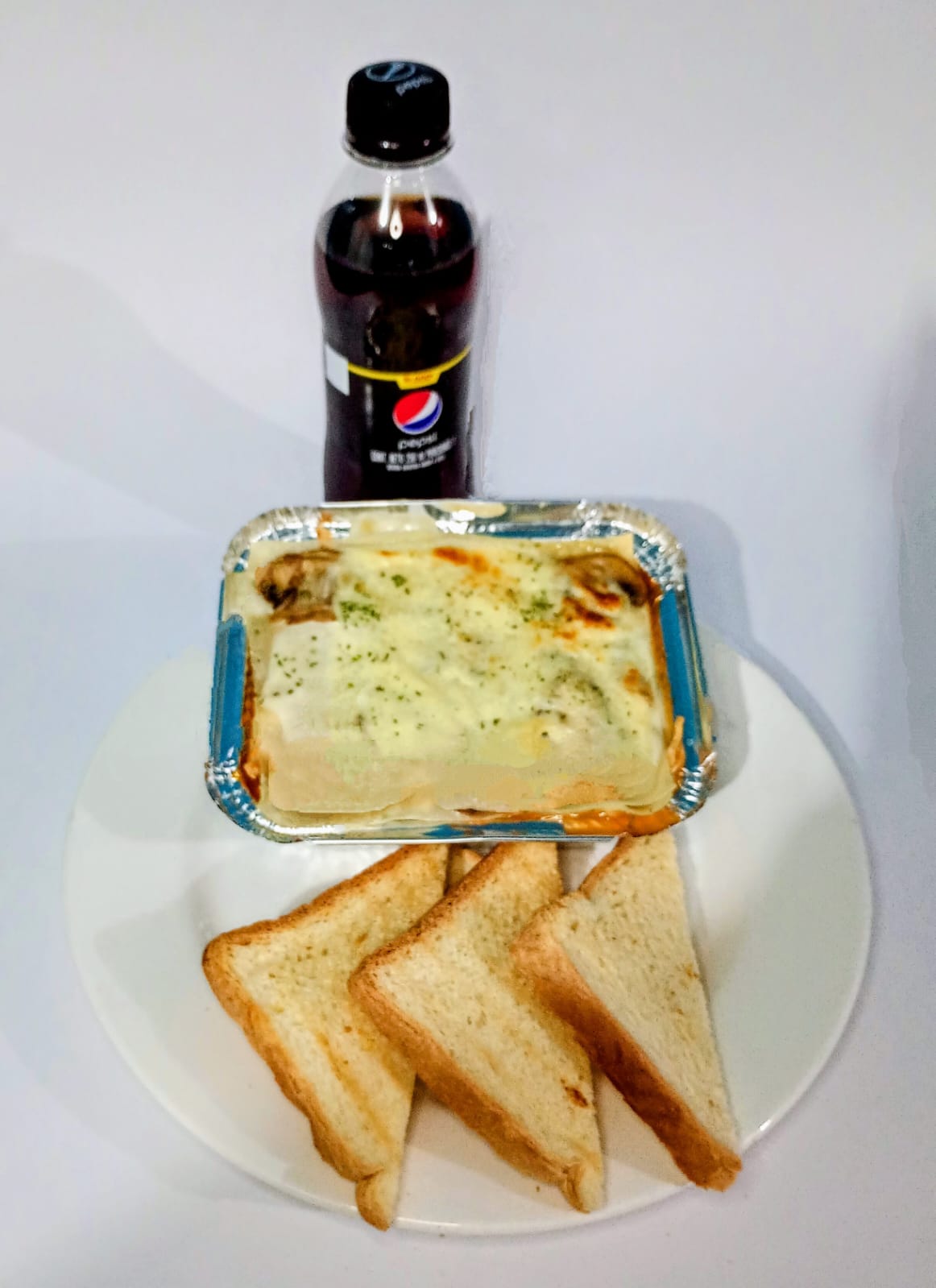 Lasaña de pollo con champiñones con pan tajado en láminas y gaseosa 250 ml.