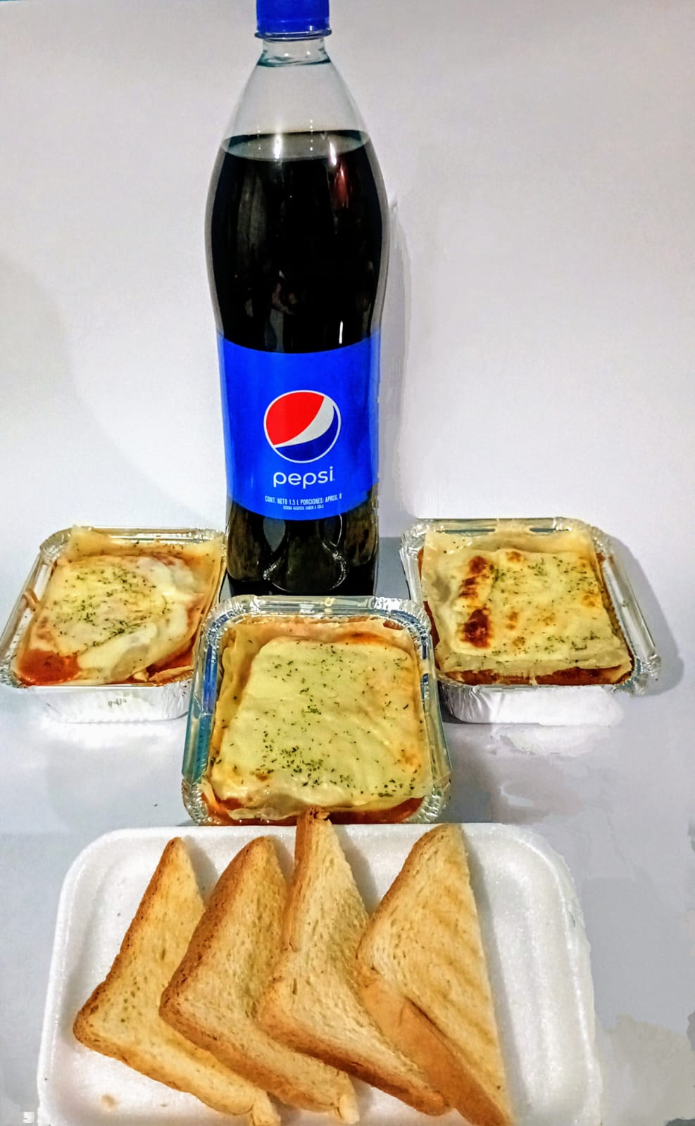 Combo: lasaña mixta, pollo y carne con pan tajado en laminas y gaseosa 1.5 ml.