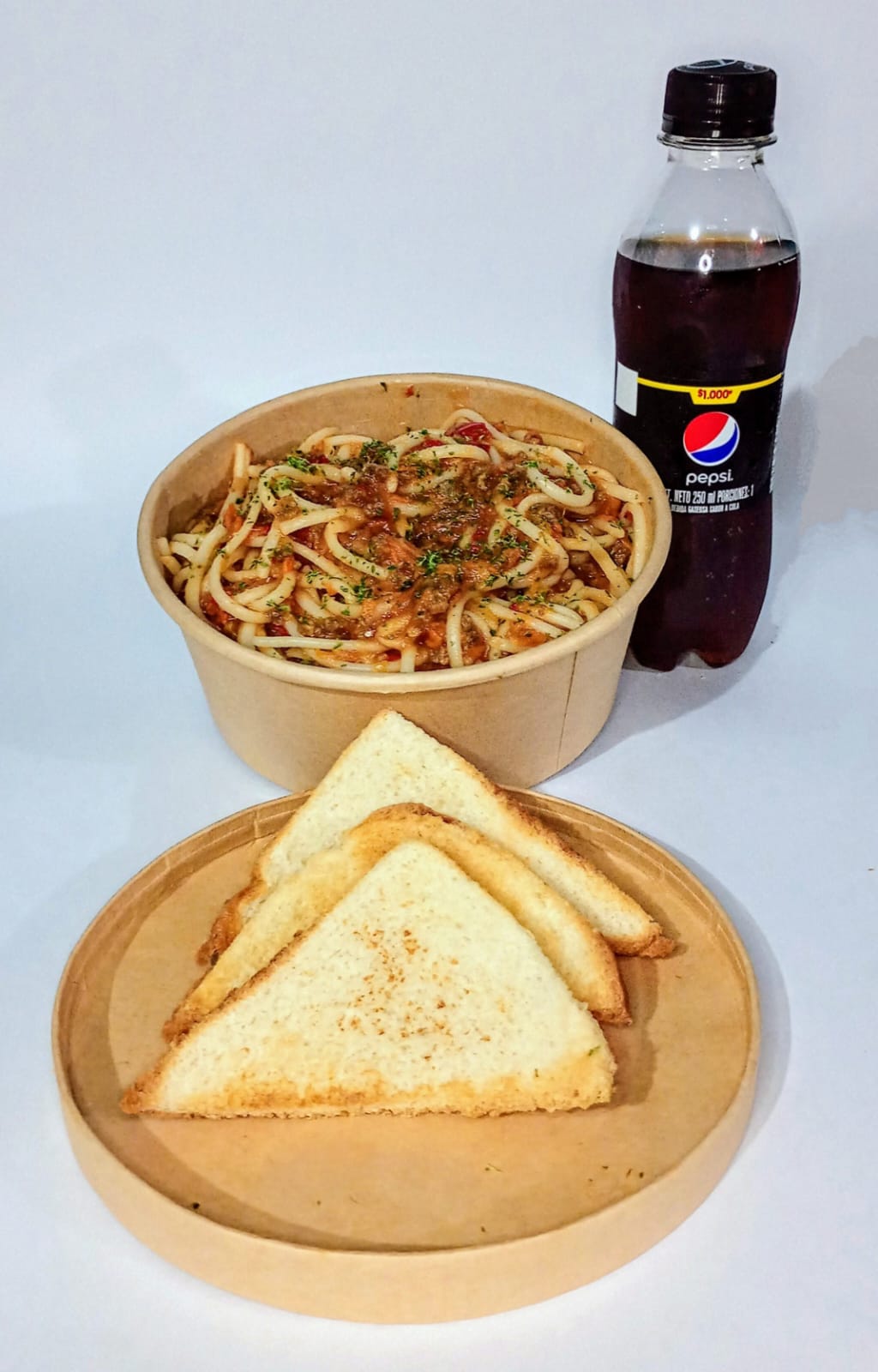 250 g De pasta boloñesa con pan tajado en laminas y gaseosa 250 ml.