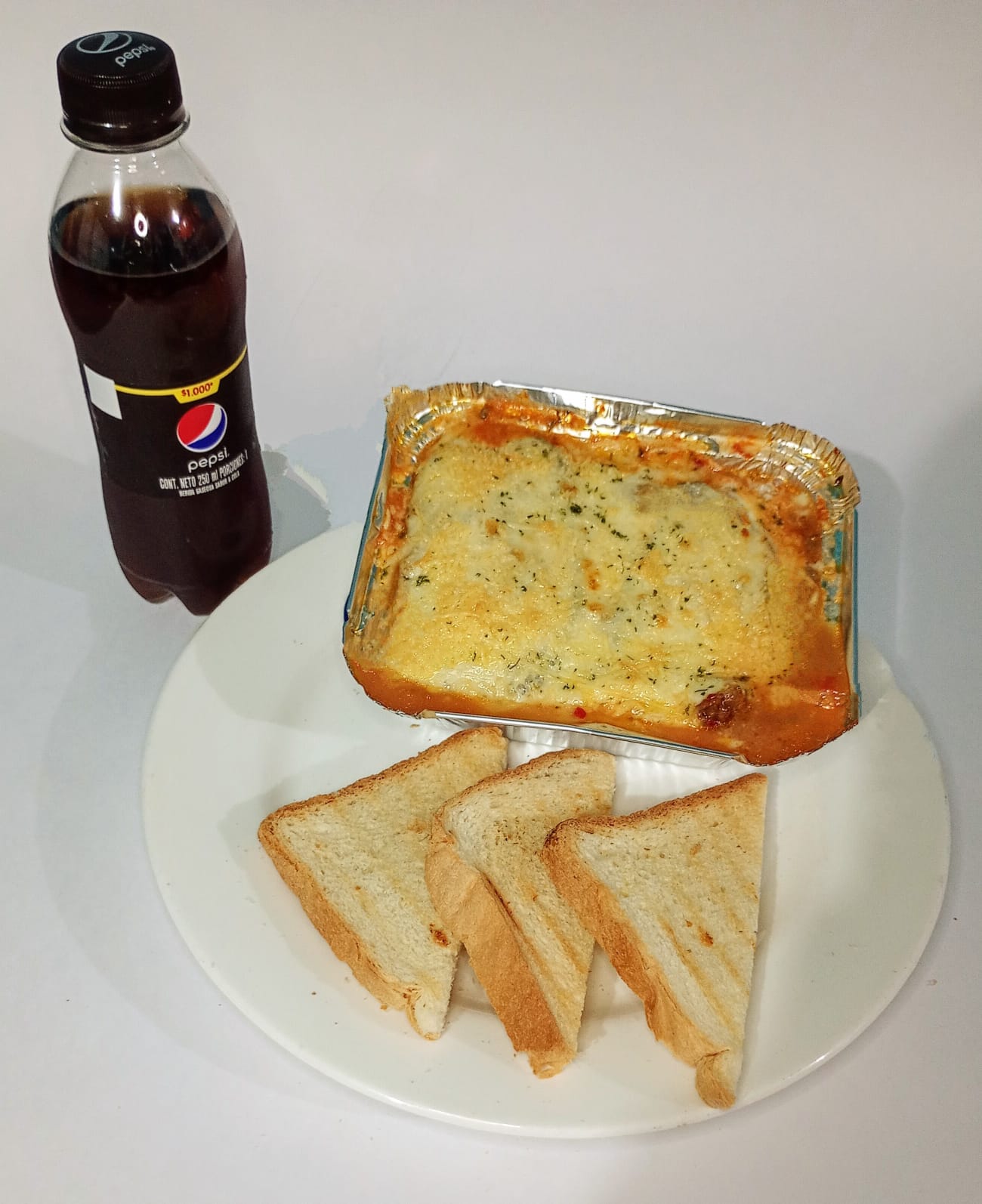 Lasaña de carne con pan tajado en laminas y gaseosa 250 ml.