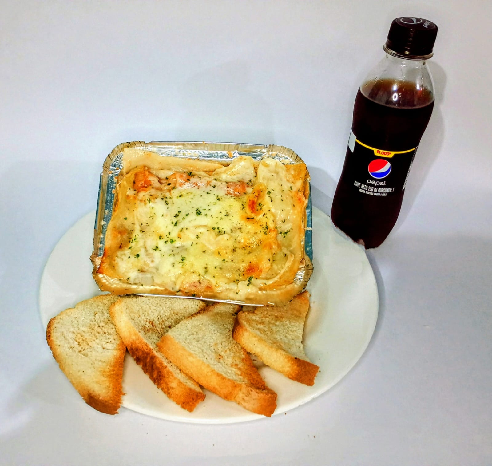 Lasaña mixta de pollo y carne molida con pan tajado en laminas y gaseosa 250 ml.