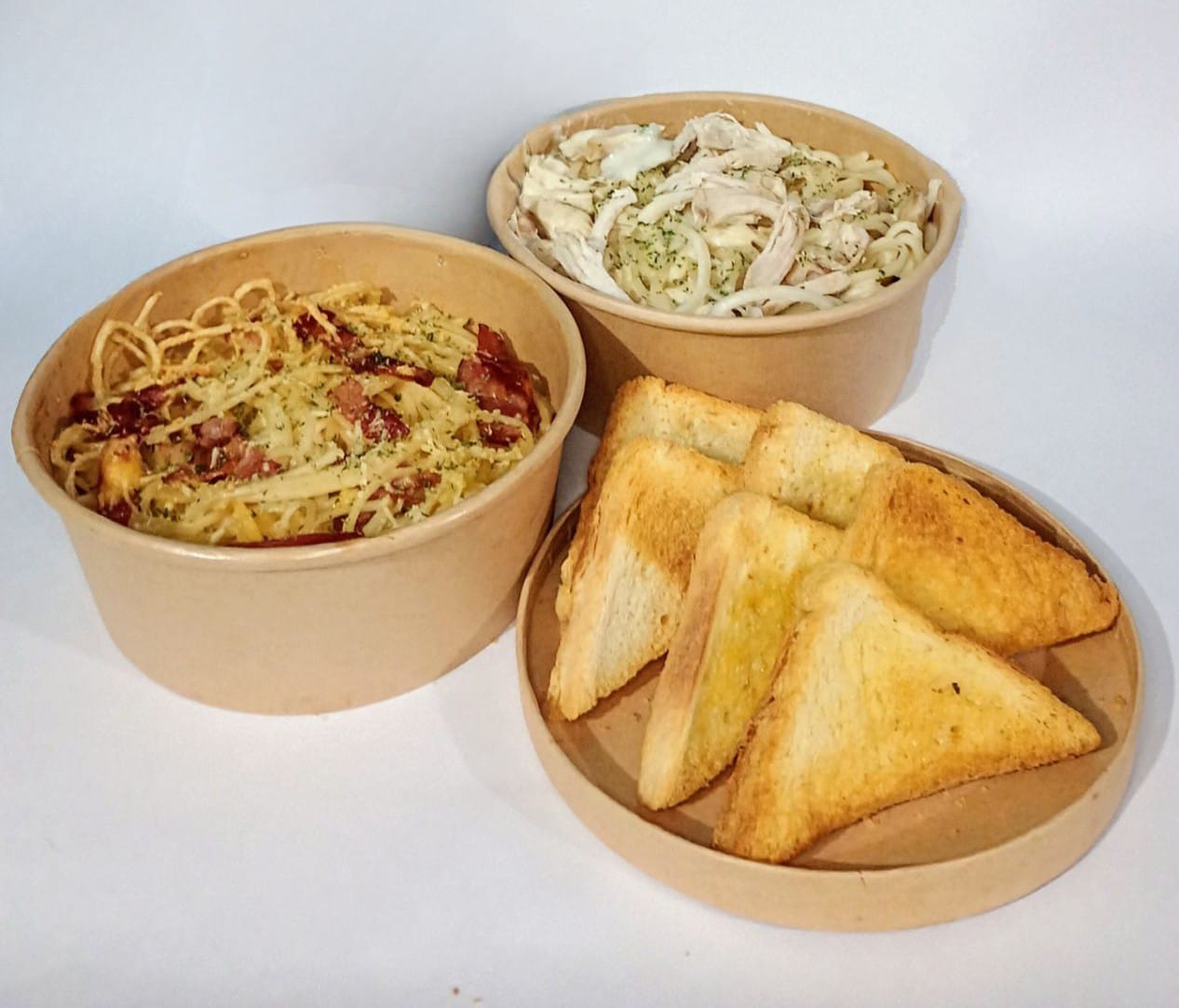 Combo: pasta de pollo y pasta carbonara con pan tajado en laminas con gaseosas 250ml.