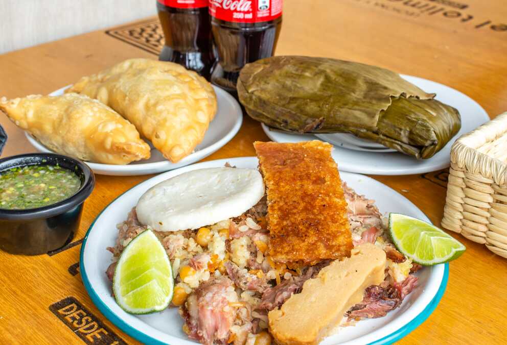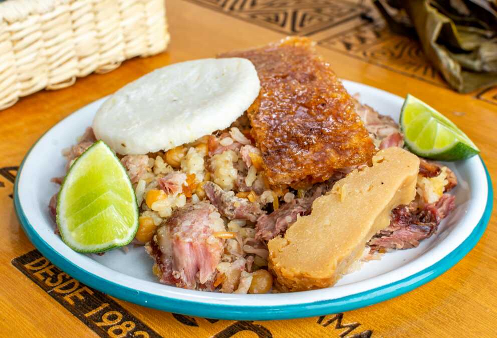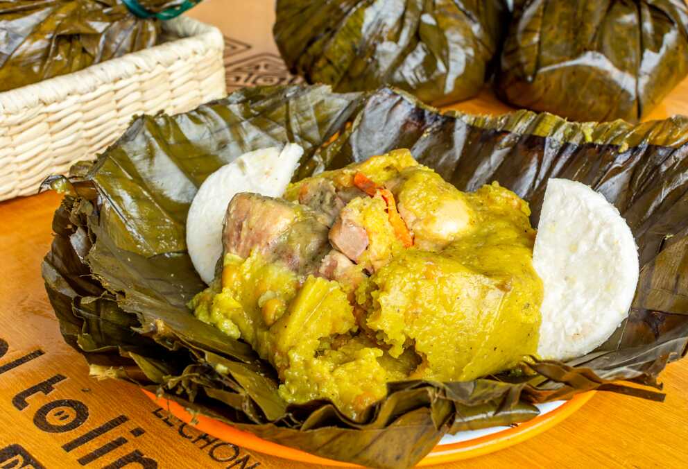 Tamal tolimense acompañado de 150 g de lechona.