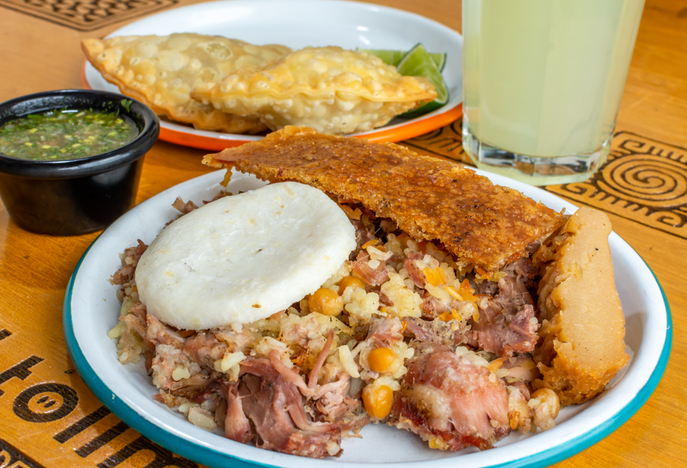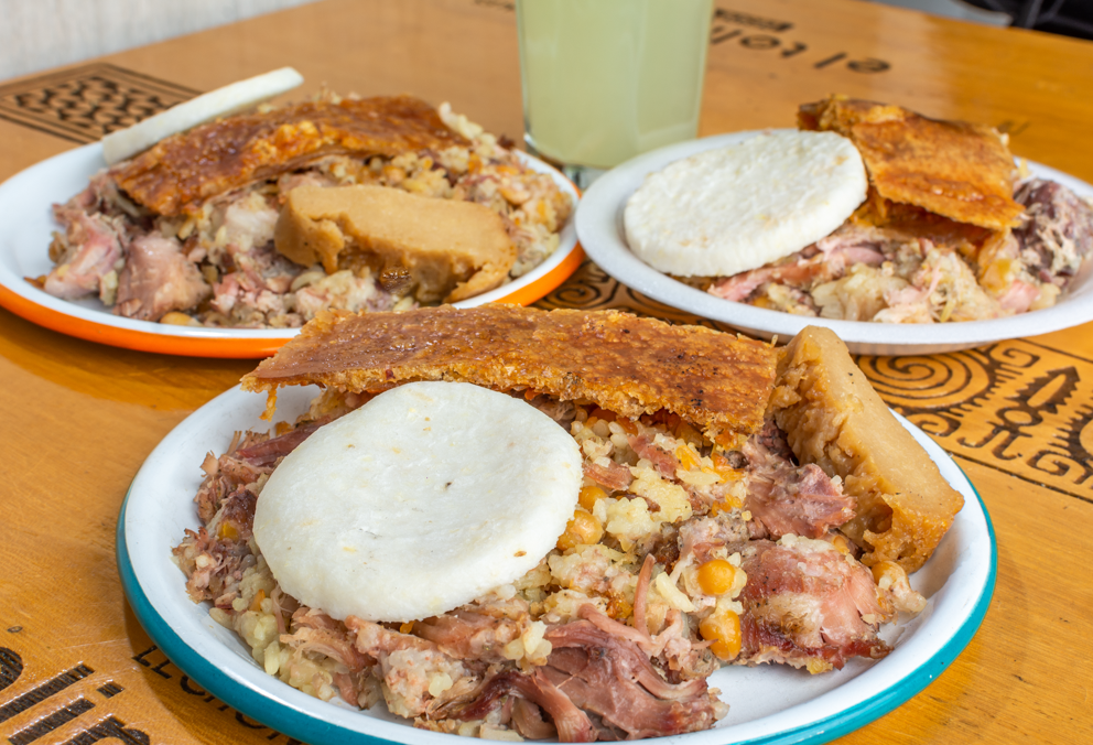 Nuestra exquisita masa de arroz, costillas de cerdo, pollo, tocino y zanahoria, envuelta en frescas hojas de plátano acompañado de arepa blanca.