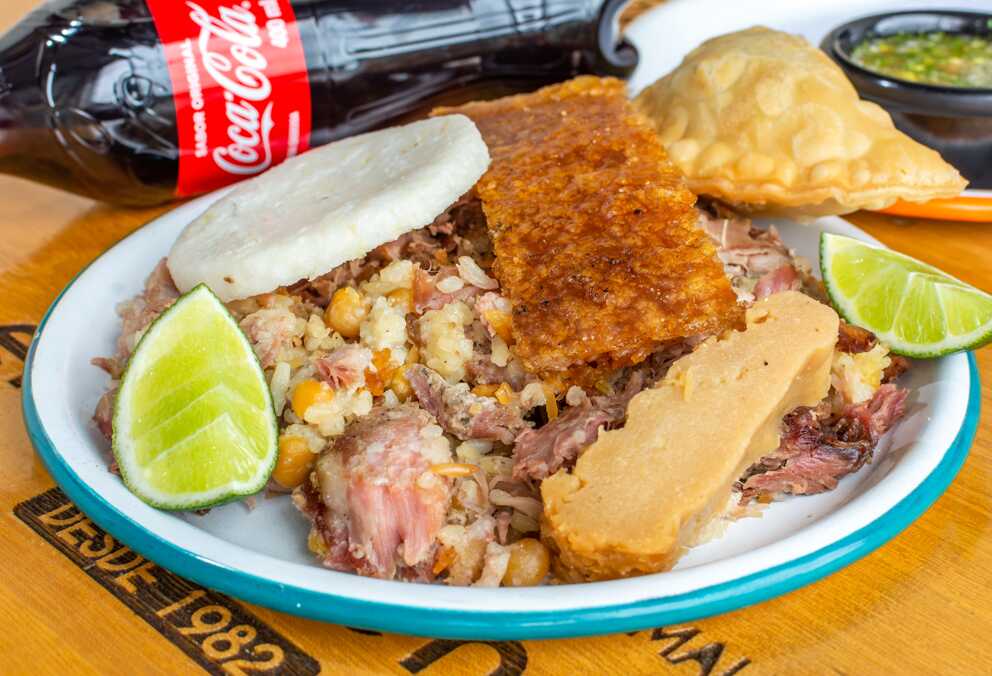 1 Porción de lechona tolimense 500 g, 3 empachonas, insulso, 2 gaseosas no retornables 250 ml sabor a elección.