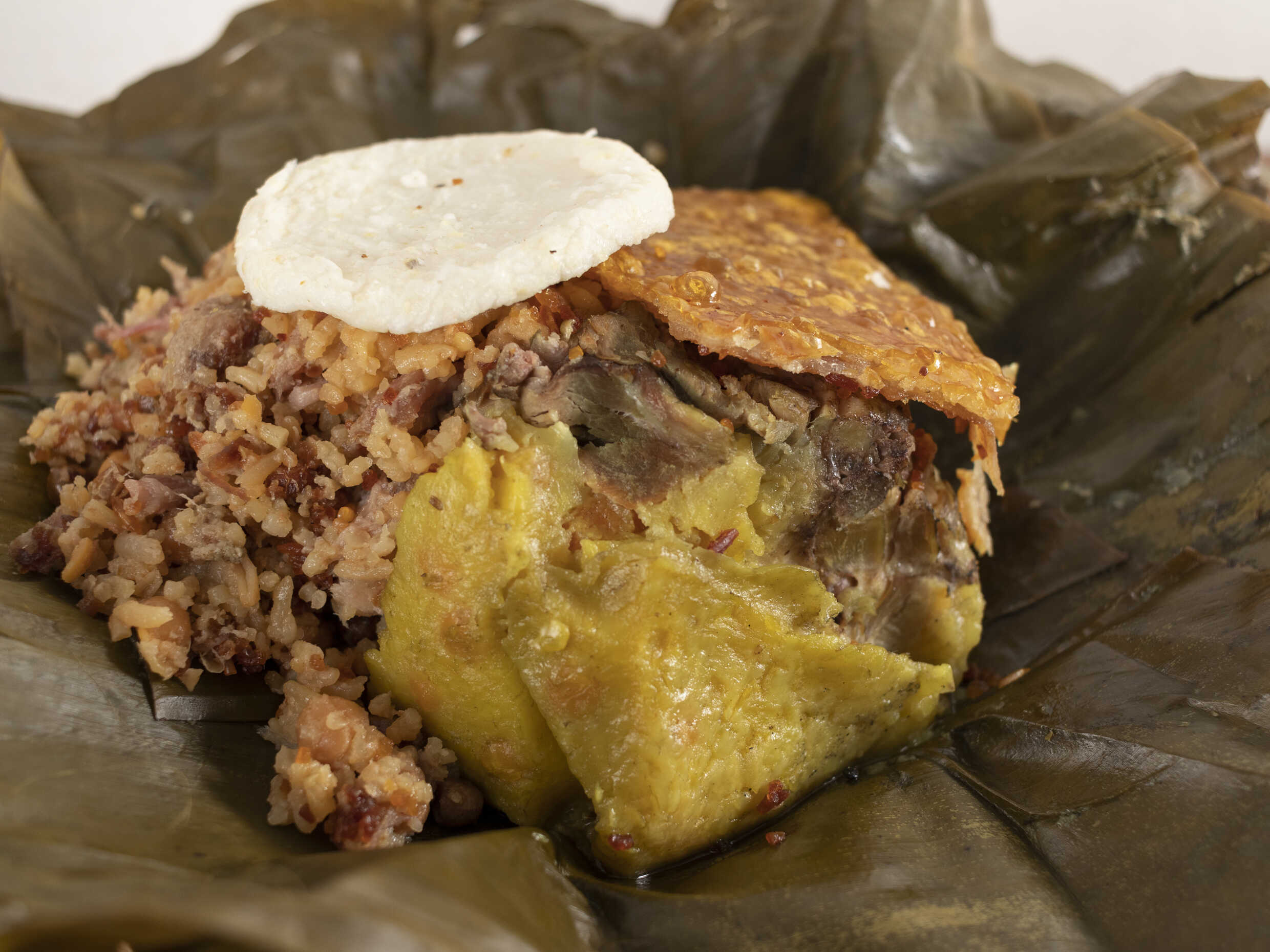 Hecho de arroz, pollo, tocino de cerdo, huevo, zanahoria, arveja, envuelto en hoja de plátano, acompañado de plátano.