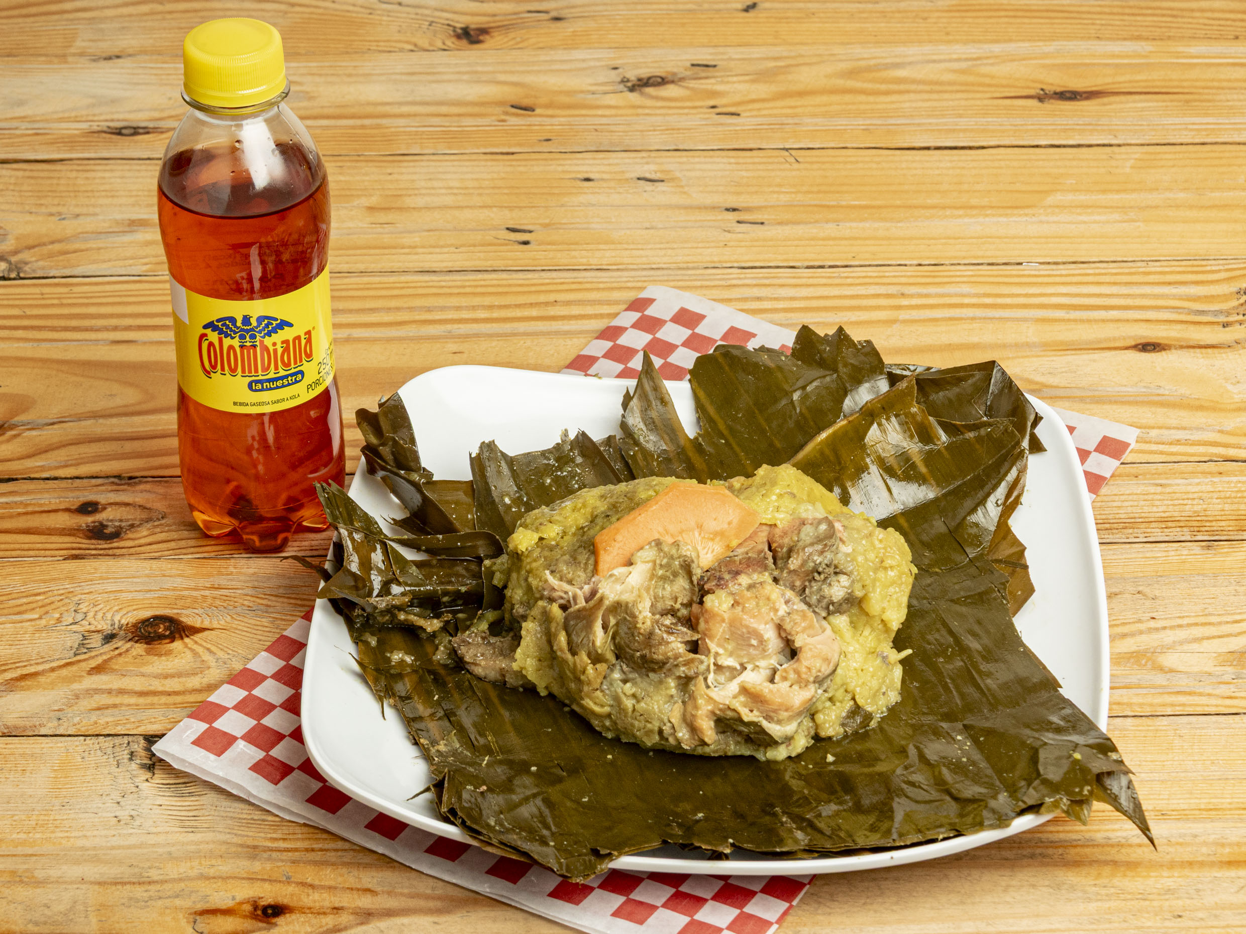Tamal de 400 g, masa de arroz 300 g, proteína 100 g, proción de pierna pernil de pollo y carne de cerdo, tocino y zanahoria.