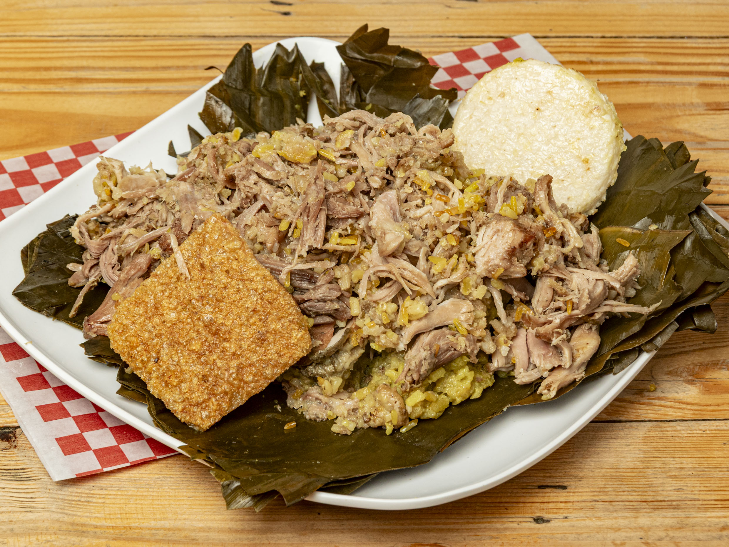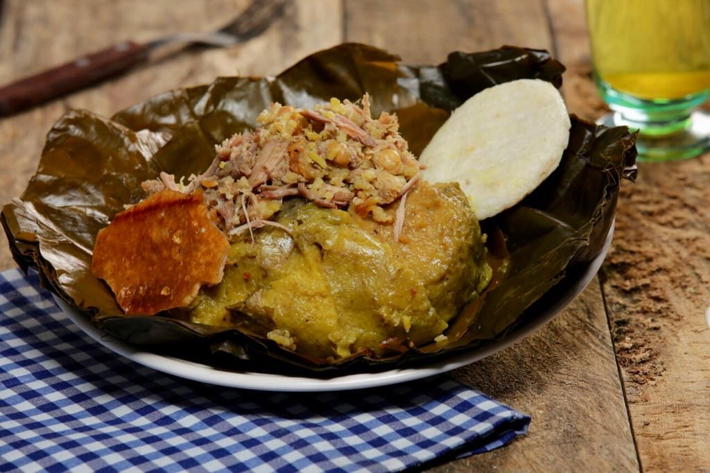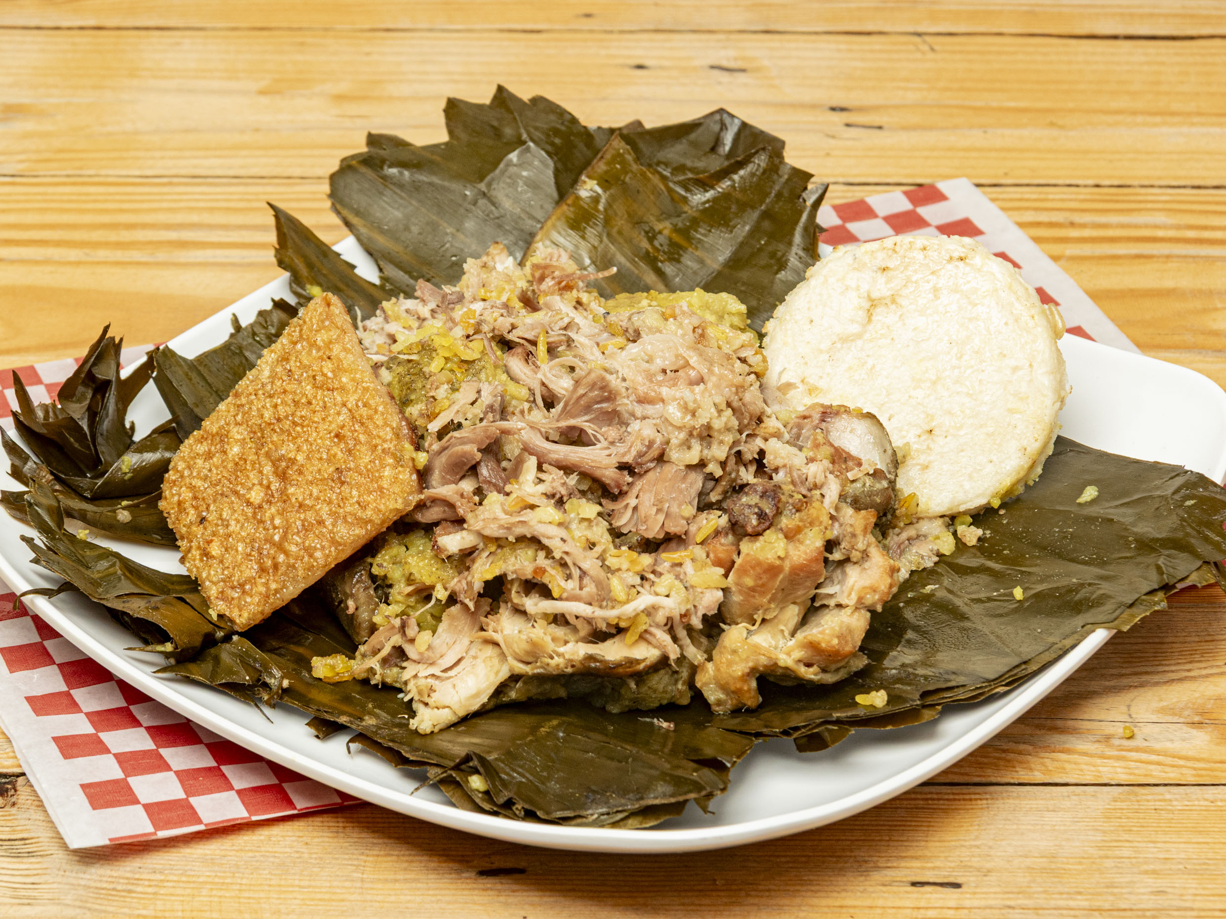 Tamal típico tolimense mixto con lechona (tamal, lechona, cuero y arepa).