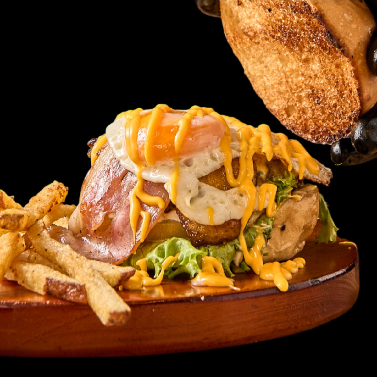 Pan Brioche, Carne artesanal 100% res, Tocineta, Tomate, Lechuga, Queso cheddar, Platano, Huevo, Acompañado de salsas.