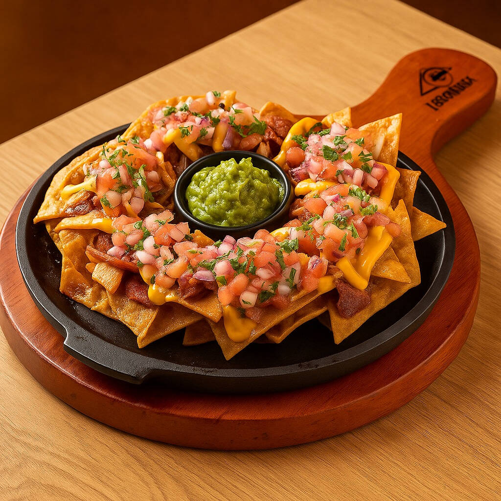 Acompañados de pico de gallo, carne legendaria, guacamole y salsa queso cheddar