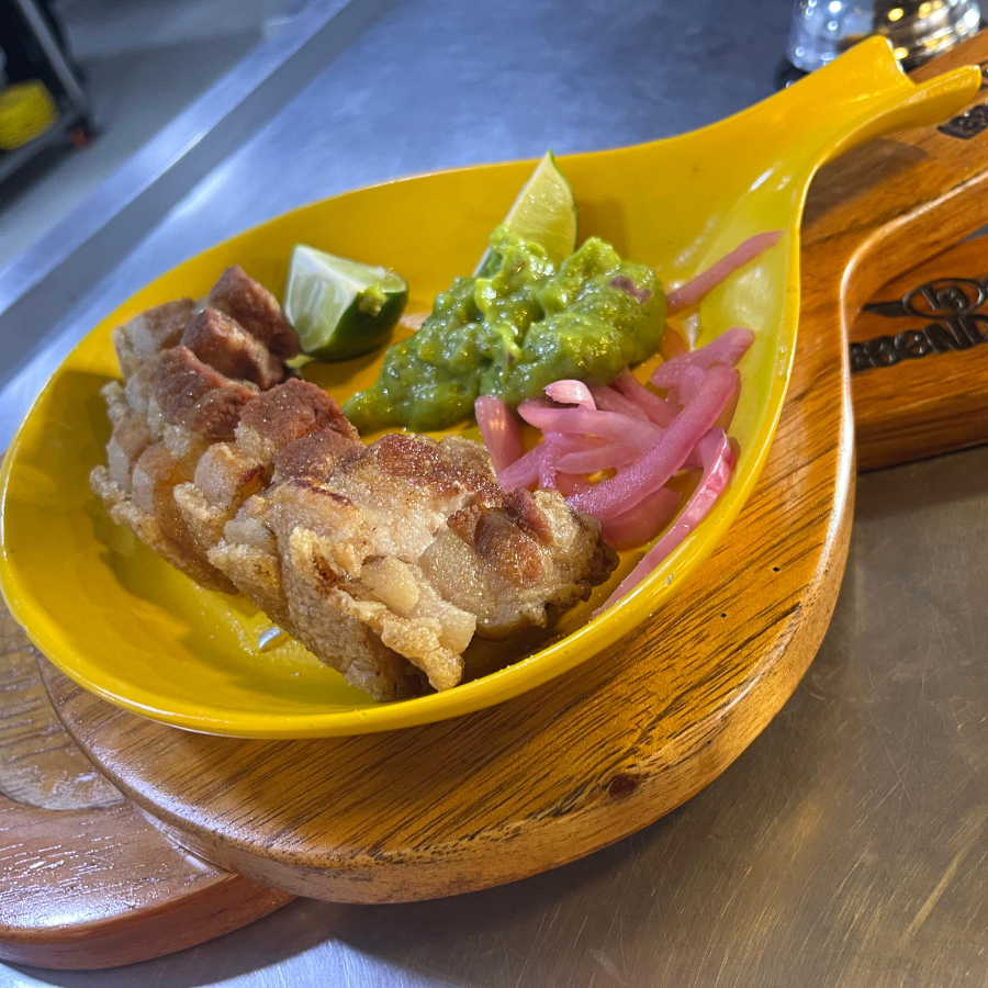 Deliciosos trozos de chicharron con guacamole y limòn