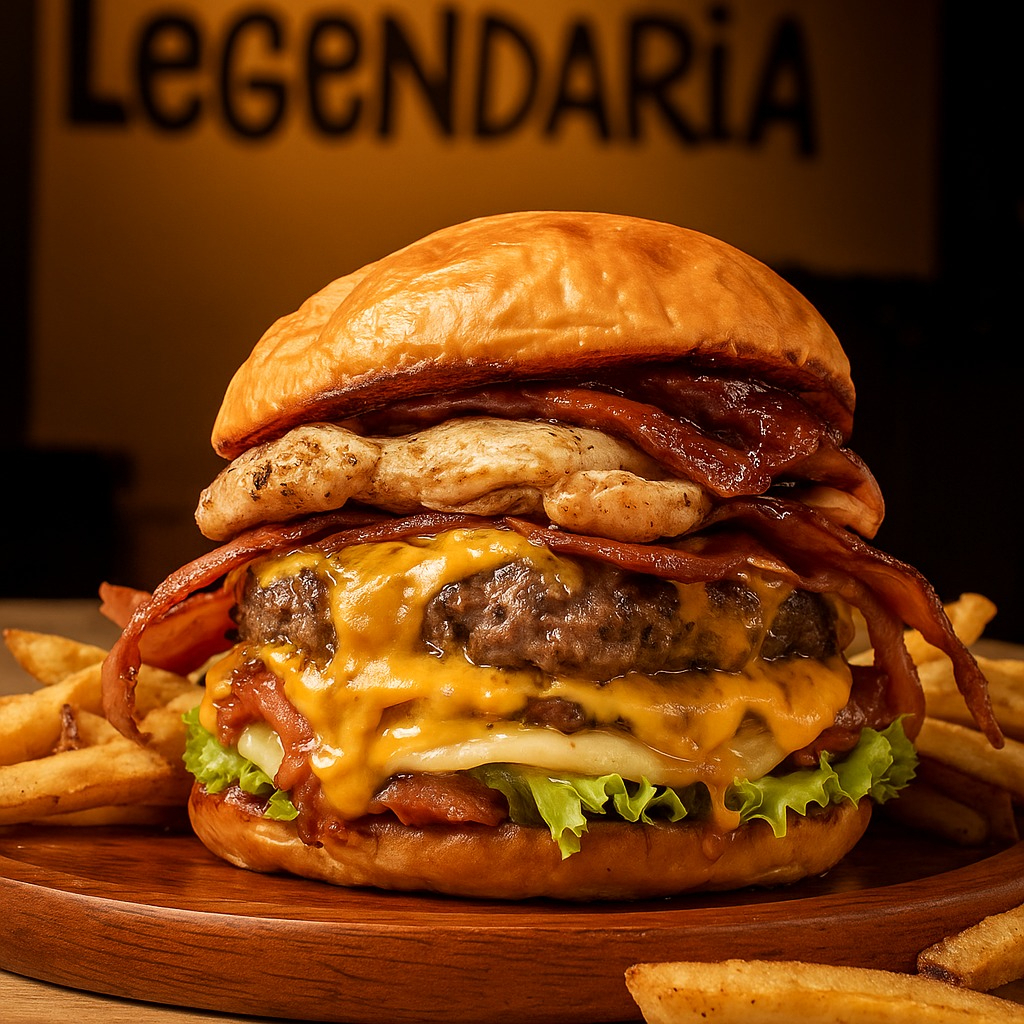 Pan brioche, pollo, carne 100% res, lechuga, tomate, tocineta, salsas, queso cheddar, cebolla caramelizada