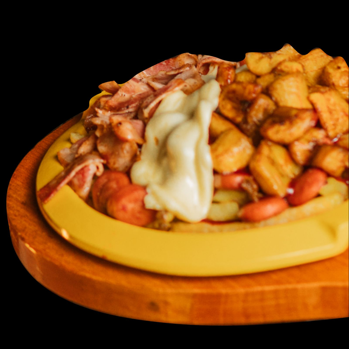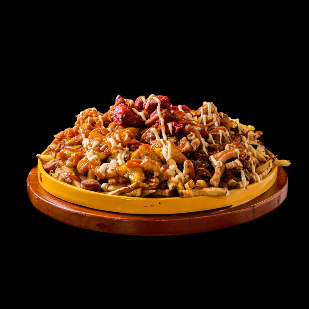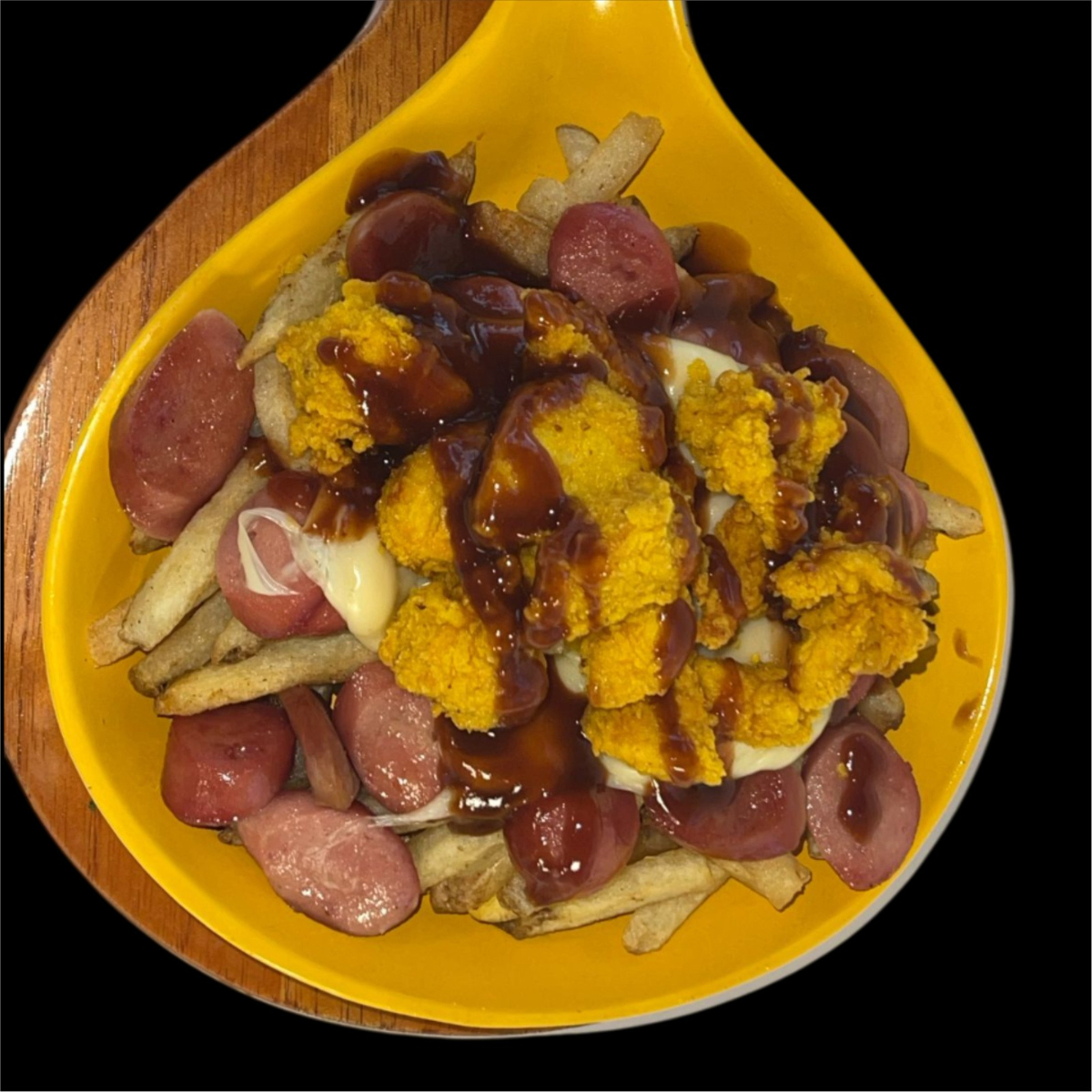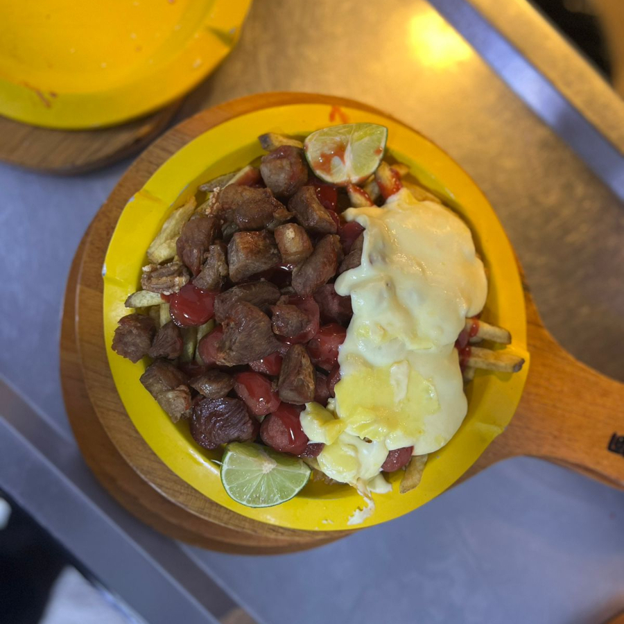 salchicha americana, papa francesa rustica, topping de costilla ahumada, maduro, queso mozarella fundido y salsas